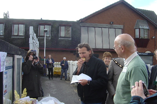 The ceremony was attended by the Mayor of Salford, Councillor Valerie Burgoyne, representatives from Greater Manchester Passenger Transport Executive (GMPTE), Northern Rail and the Association of Community Rail Partnerships (ACoRP) as well as other community representatives plus staff and students of Eccles College. The Chairman of Freccles, David Yates, opened the proceedings before handing over to Eoan Edwards, Treasurer and leading light behind the project. Stuart Wattam, Principal of Eccles College, spoke about the project before handing over to Christopher Eccleston to officially unveil the mural.